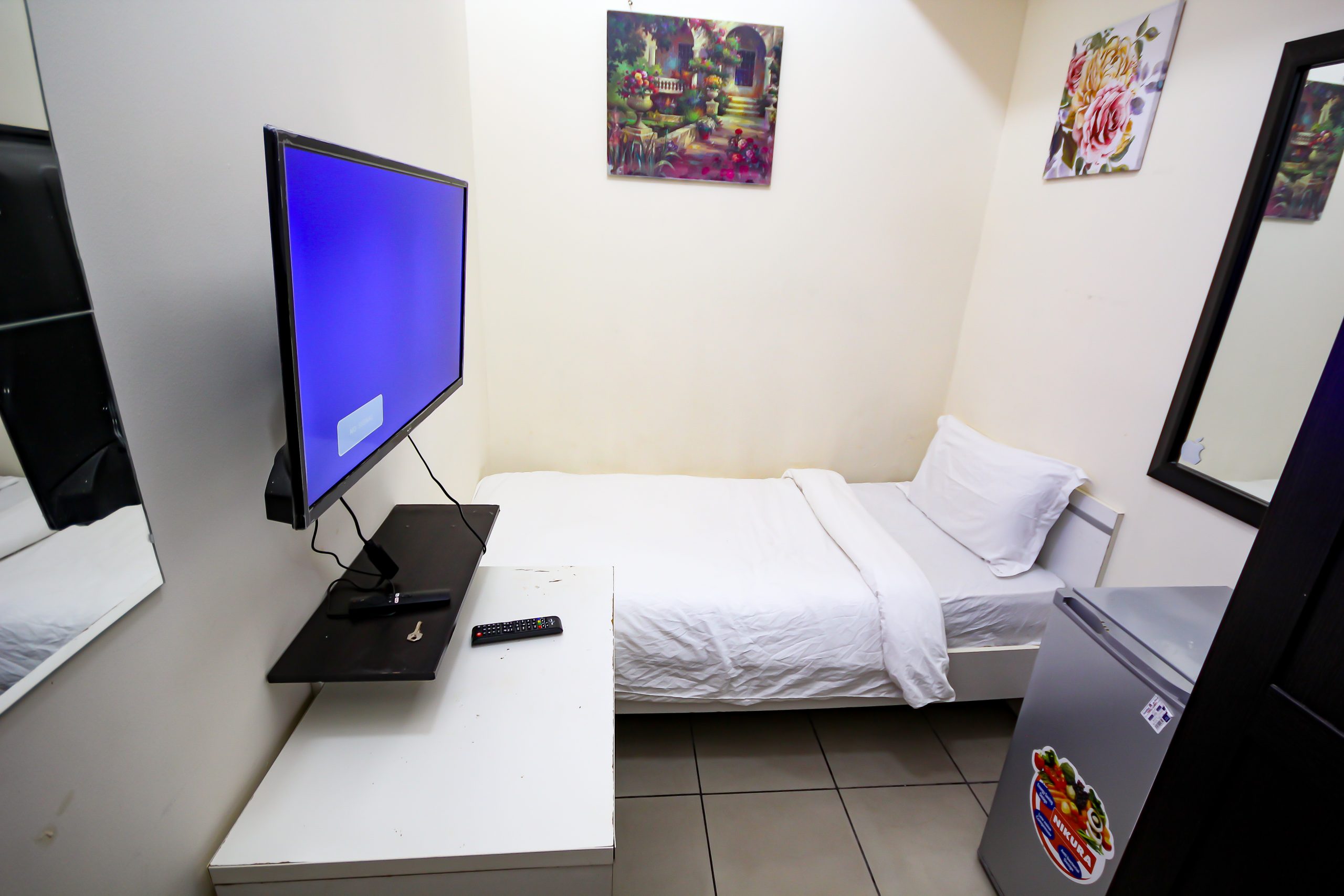 - Comes with basic furnishings including bed, cupboard