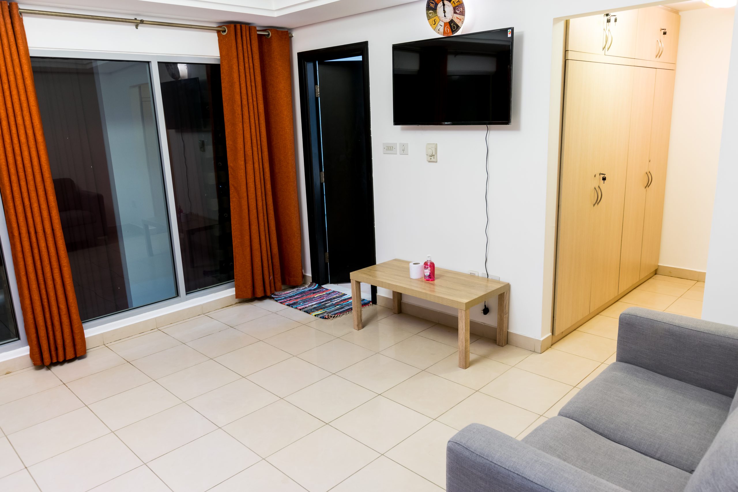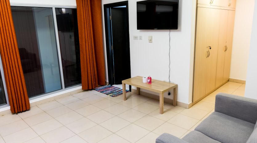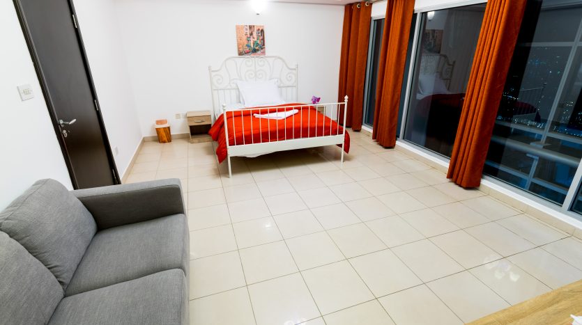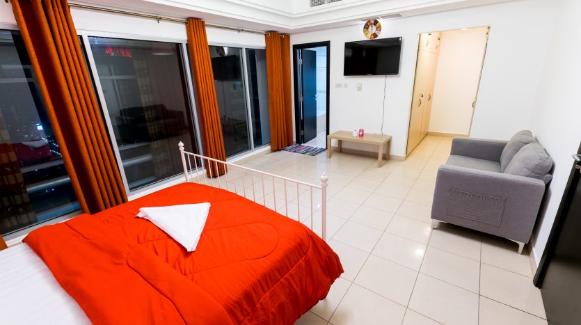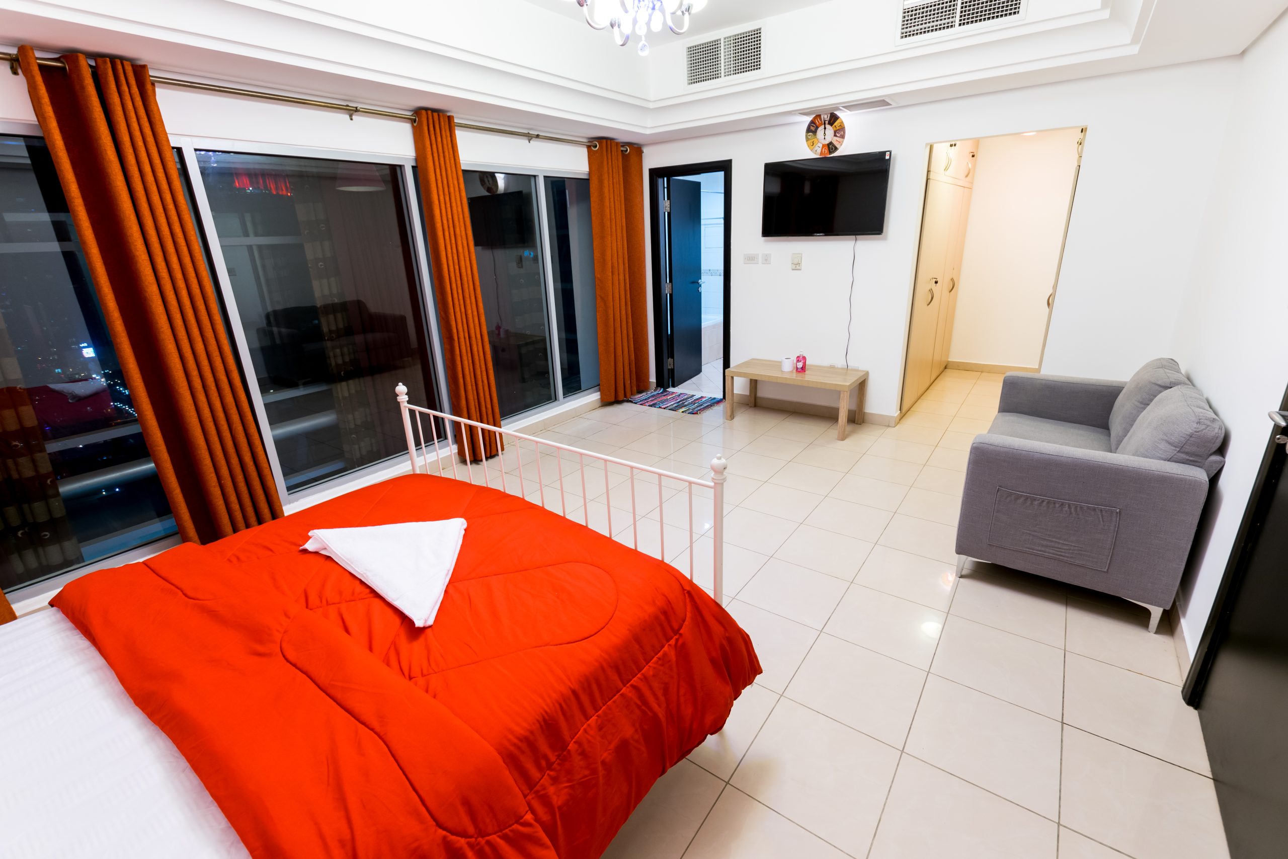 Upgrade your lifestyle with this elegant master room for females in La Riviera, Dubai Marina, featuring a non-openable window, sea view, attached bathroom, built-in cupboard, 40-60L fridge, and a 40-inch TV.