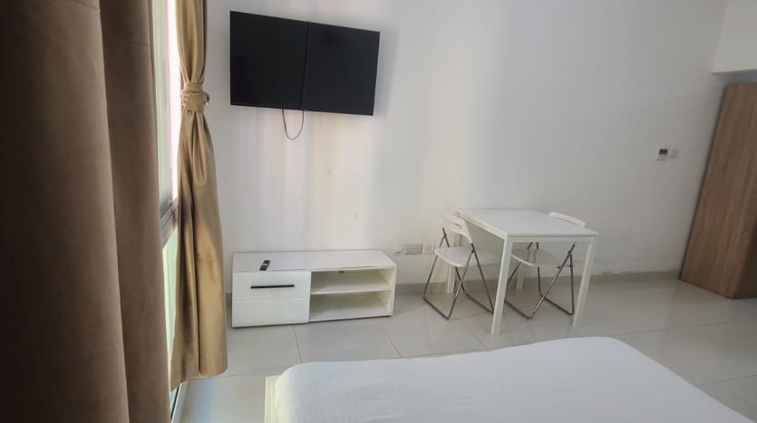 this picture shows a bed and TV screen in a Studio for Rent in Marina