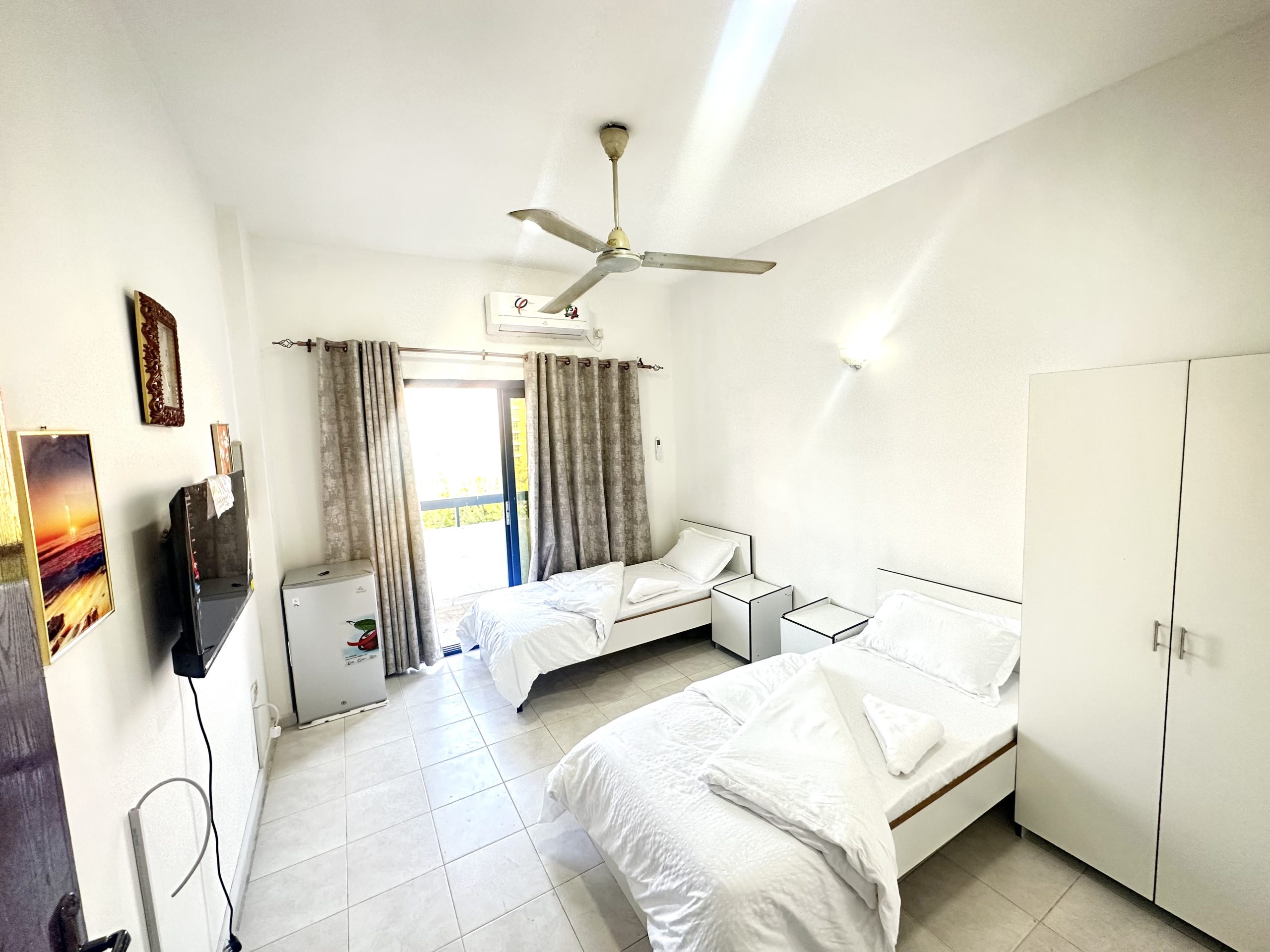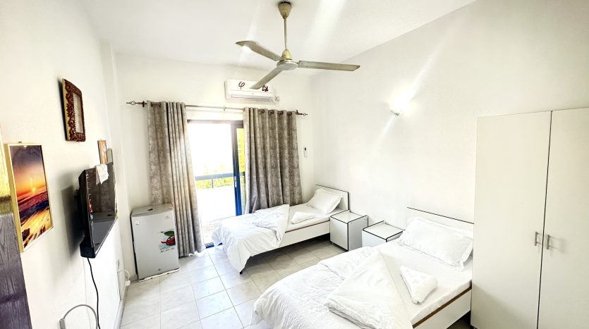 A spacious semi-master room for rent in Al Qusais Bin Daher, suitable for individuals or couples. The room includes a private balcony and street-facing view, offering a calm and airy atmosphere.